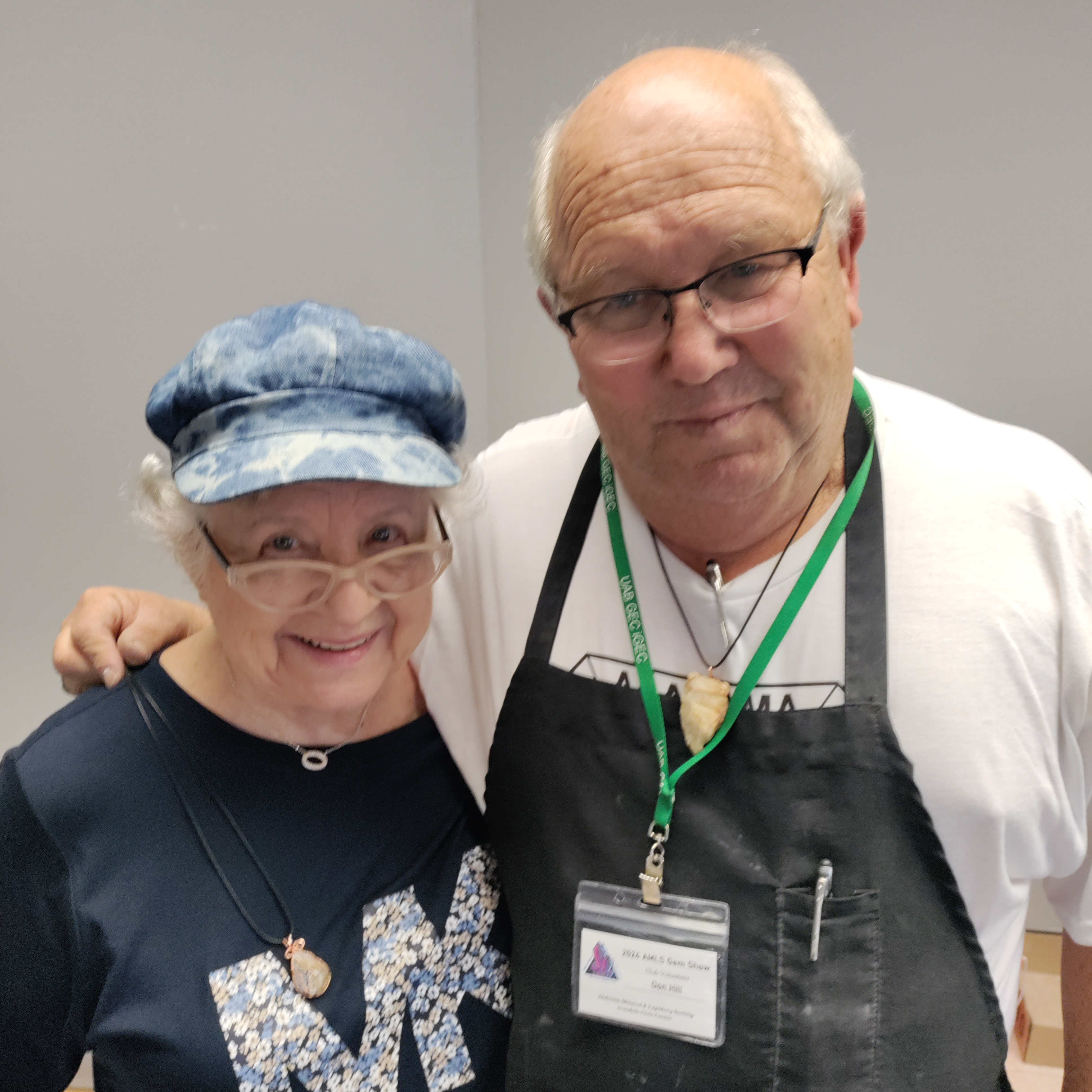 From Don Hill The picture is of me and Mary King. She is a 84 year old lady that had on her bucket list to crack Geode. She then asked about how the cabbing machine worked. I showed her with a piece of the geode she cracked. After polishing I went ahead and wire wrapped it for her, she was so happy - DonDon is a long time member that has always provided an excellent presentation at ever show. His dedication to the kids corner, club demonstrations and of course the geode cracker is perhaps the greatest draw we have to the show every year. |
